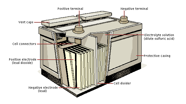 A battery is a portable energy source that consists of one or more cells that transforms chemical energy into electricity. A standard car battery is made up of six cells ran in series, each one of these cells has 2.1 volts meaning a standard car battery is fully charged at 12.6 volts not 12volts.