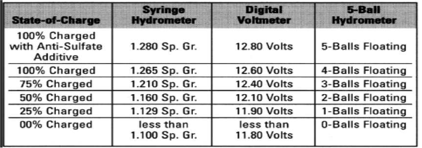 Rule #1 – Maintain a consistent charge in the battery between 12.4 and 12.6 volts at all times. Batteries that sit without being used need to be charged. If the battery is left hooked up in the application, it needs to be charged more often than when it is disconnected. Charging a battery every month while it sits is the best course of action. We recommend slow chargers for all batteries (2amp/trickle chargers) usually an overnight charge will be sufficient. Checking the voltage is the easiest way to know if a battery is fully charged but if you can access the cells a hydrometer is the most accurate. (see chart 1)