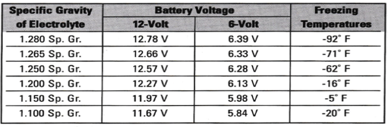 Maintenance-free, non-accessible batteries are designed to eliminate the need to add water. Yet the volume of electrolyte above plates may eventually become depleted due to abnormal conditions such as high heat or improper regulator setting. use a voltmeter to check the state of charge. See chart under “Charging Tips” to determine if charging is necessary. DO NOT OPEN FLUSH COVER BATTERIES! If opened, serious personal injury can result and warranty will be voided.